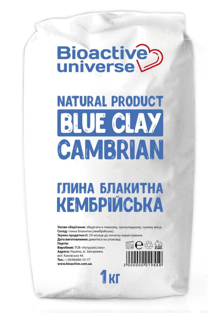 Блакитна (кембрійська) глина Біоактив Юніверс, завдяки своєму багатому мінеральному складу, має широкий спектр корисних властивостей. Глина містить кремнезем, каолін, кальцій, магній, калій, натрій, залізо та інші мікроелементи, які відіграють важливу роль у підтримці здоров'я та краси шкіри. Вона також багата киснем та карбонатами. Широко застосовується в косметології та медицині, так як має антибактеріальні, протизапальні та абсорбуючі властивості. Сприяє поліпшенню кровообігу та обміну речовин, зменшенню набряклості та усунення подразнення шкіри. У косметології вона часто використовується в масках для обличчя, щоб звужувати пори, зменшити жирний блиск і покращити колір обличчя. І купити блакитну (кембрійську) глину Біоактив Юніверс в роздріб або оптом від компанії «Bioactive universe» (Біоактив Юніверс) Ви можете прямо тут.