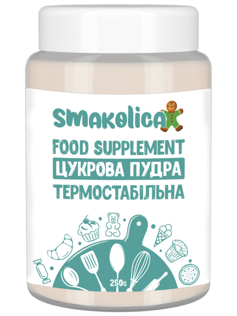 Цукрова (кондитерська) пудра термостабільна дозволяє відразу декорувати вивантажені з печі хлібобулочні вироби, не чекаючи їх охолодження. Все тому, що вона, відповідно до назви, не тане і не тече під впливом високих температур, зберігаючи вишукану білосніжність. Не злежується і не береться грудками, а ще вона справляється з випробуванням водою і тане тільки в роті, розщеплюючись під дією слини. Пудра робить випічку візуально привабливішою, сприяє подовженню свіжості, завдяки вологоутримувальним властивостям, і покращує аромасмакові якості. Натуральність і рослинне походження всіх інгредієнтів дає змогу використовувати її в дитячому, веганському та вегетаріанському харчуваннях.
