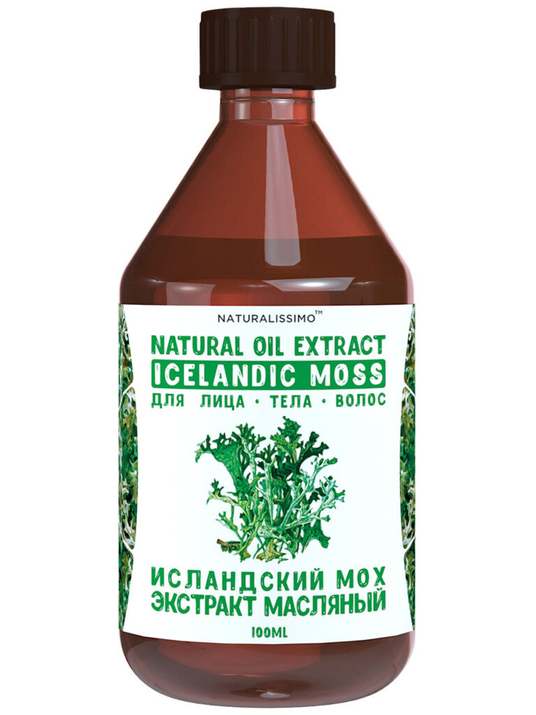 Олійний екстракт ісландського моху — натуральний засіб, що виготовляється в промислових умовах. В основі виробничого процесу лежить олійна екстрактація, у процесі якої всі цілющі компоненти рослинної сировини переходять у високоякісну рослинну олію. Унікальне співіснування в одному рослині моху та водорості зумовлює багатий хімічний склад продукту: слизи, мікроелементи, біологічно активні компоненти, вітаміни. Екстракт ісландського моху придатний для споживання в їжу та зовнішнього нанесення.
