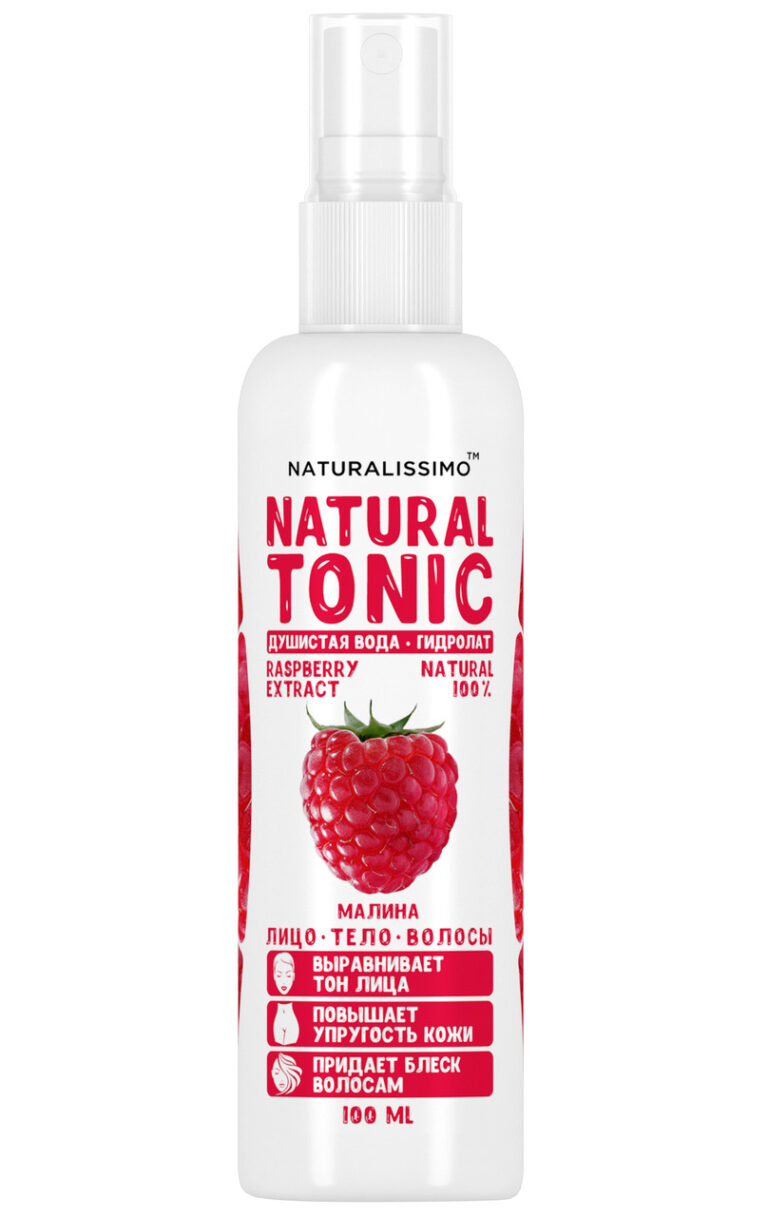 Гідролат малини являє собою прозору рідину для освіження та зволоження шкіри всіх типів. Його отримують методом парової дистиляції виключно натуральних компонентів. Натуральний тонік містить велику кількість корисних ефірних олій, мікроелементів, кислот і вітамінів, він має приємний аромат, протизапальні та протимікробні властивості. Під час догляду за шкірою рекомендують використовувати тонік як у чистому вигляді для відновлення водного балансу, так і в складі домашньої натуральної косметики.