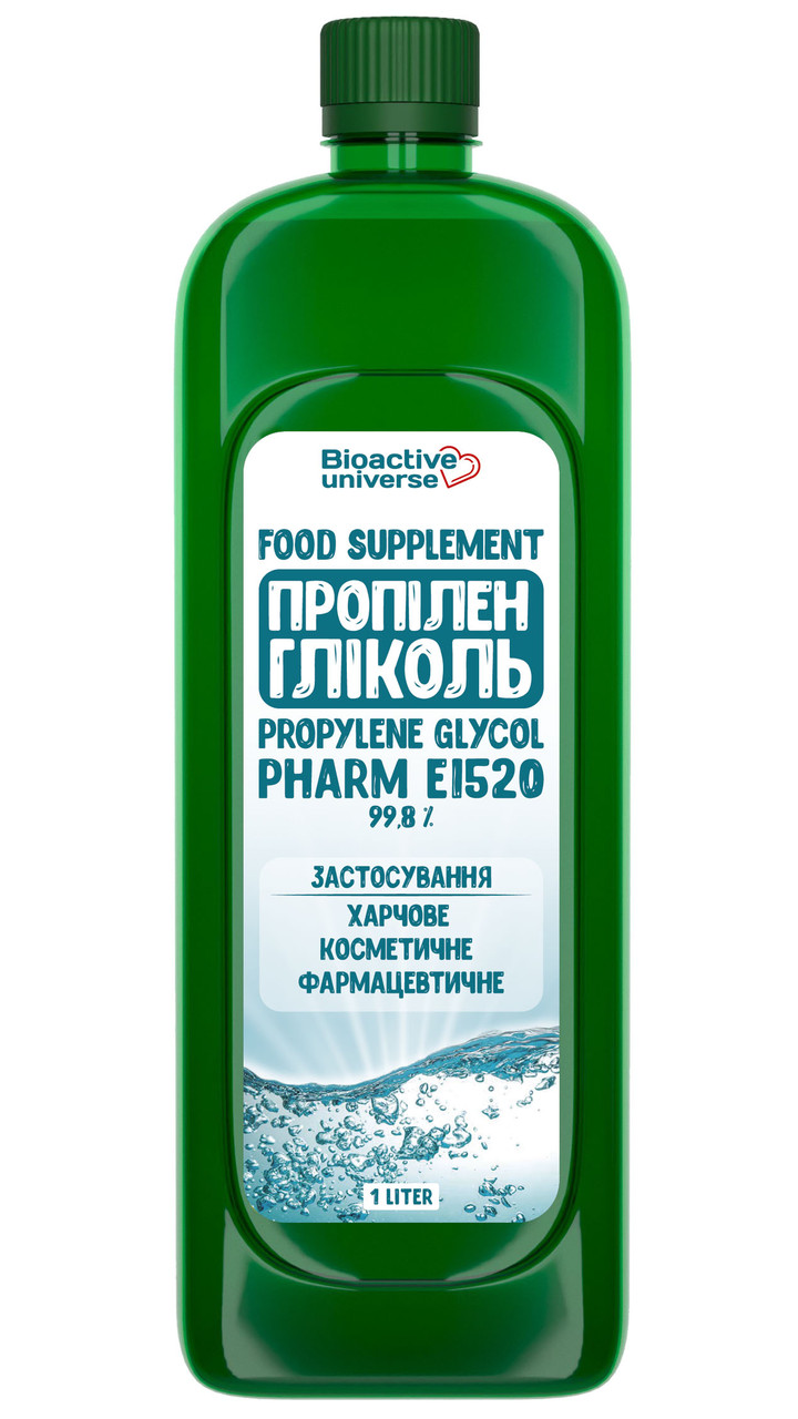 Пропіленгліколь Фарм Біоактив Юніверс (Е1520) являє собою органічне з'єднання, яке використовується в різних галузях, включно з косметикою, фармацевтикою та харчовою промисловістьом. Він зволожує й покращує структуру шкіри, сприяє кращому проникненню активних інгредієнтів, має стабілізувальні властивості, емульгує й розчиняє рослинні активи, захищає від грибків, бактерій, пересихання й окиснення інші інгредієнти смесей. І купити пропіленгліколь у роздріб або оптом Ви можете прямо на сайті виробничої компанії «Bioactive universe» (Биоактив юниверс).