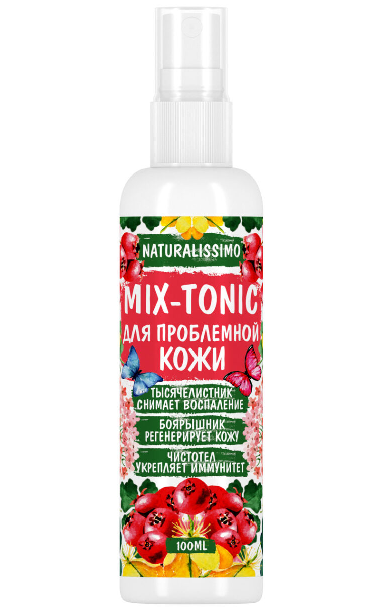Мікс-тонік для догляду за проблемною шкірою — це натуральний косметичний засіб на основі рослинних екстрактів деревію, глоду та чистотілу. Цей тонік (гідролат) покращує стан шкіри завдяки своїм унікальним властивостям. Професіонали косметологи зазначають найяскравіші властивості — це боротьба із запаленнями та висипання, заспокійлива дія та підвищення імунітету шкіри. Підходить для щоденного застосування, оздоровлює й як наслідок, покращує зовнішній вигляд і стан шкіри.